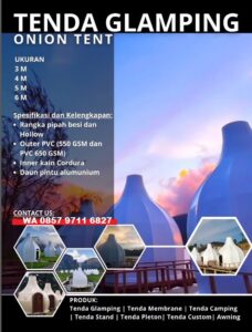 Jasa pembuatan tenda glamping adalah solusi terbaik bagi Anda yang ingin membangun fasilitas wisata alam modern dan nyaman. Dengan desain yang menarik, struktur kokoh, serta material tahan cuaca, tenda glamping dapat meningkatkan nilai bisnis resort maupun tempat wisata Anda. Beragam pilihan model seperti dome, safari, bell tent, hingga cabin bisa disesuaikan dengan konsep lokasi wisata.